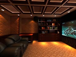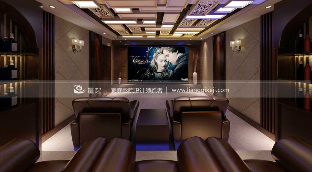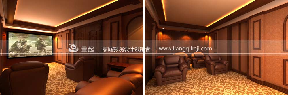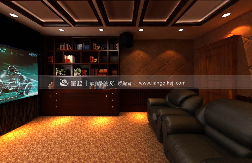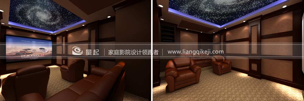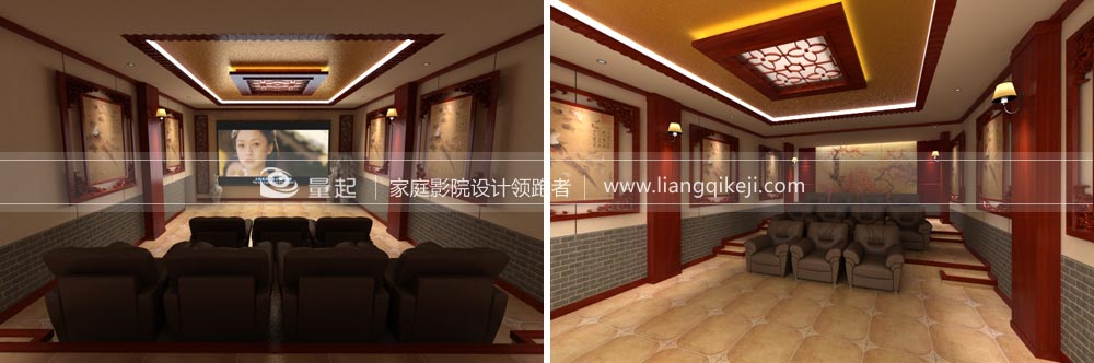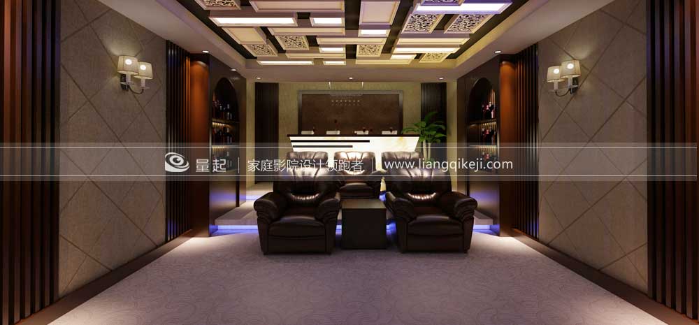 中式古典装饰重视文化意蕴,配饰常用字画、古玩、卷轴,加上精致工艺品进行点缀,更具文化韵味和独特风格,将现代影音与中国传统家居文化的独特魅力完美融合。沉稳的色调,摇曳的灯光,中式的木棱,精美的木雕艺术,营造出一幅中式品味的美丽画卷。同时又不拘泥于传统中式风格的章法,加入了大量舒适皮质沙发、星空顶等现代元素。