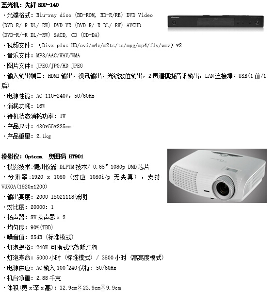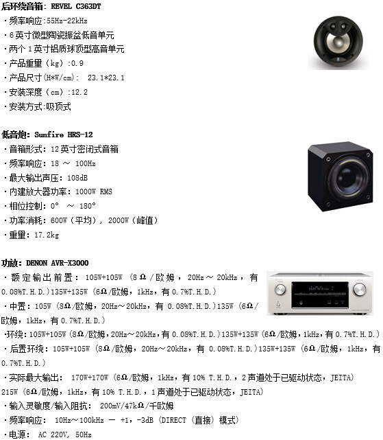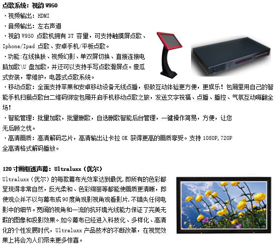 考虑到将视听室空间的最大化利用,同时达到最佳的视听效果,将采用7.1声道影院音箱。投影幕布方面,综合考虑前墙宽度,观影距离,房间高度,以及观影效果,建议幕布德国优尔120寸画框透声幕。以下是我们为本案推荐选择的两套方案的主设备。