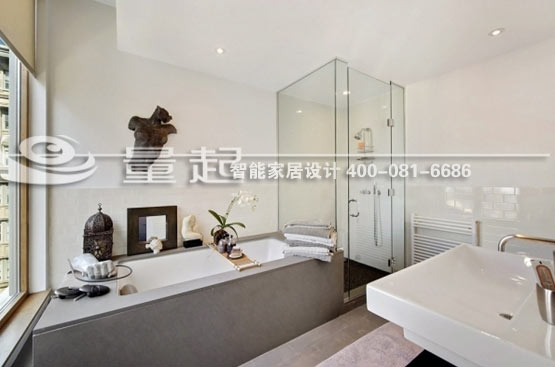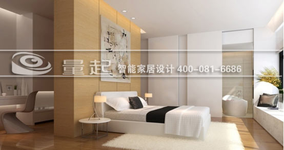 房间内的卫生间通过位移感应开关基本照明灯光,当人离开的时候,灯光自动关闭,有需要的时候也可以通过面板来控制卫生间灯光。在卫生间门口的控制面板上选择灯光场景,例如选择:“洗浴模式”,卫生间灯光亮起,换气扇打开(也可以单独开关换气扇),卧室房间内的灯光渐渐暗下来。