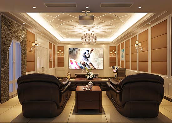 顾先生家别墅面积较大,有足够的房间可用,设计师选择了别墅二楼的一个大房间来做家庭影院,并且做了专业家庭影院设计以及声学、美学设计,用了足量的声学材料,通过专业的声学装修,为顾先生打造了一套完整的家庭影院系统。同时和家庭智能中控系统相连,可以一键实现“影院模式”。