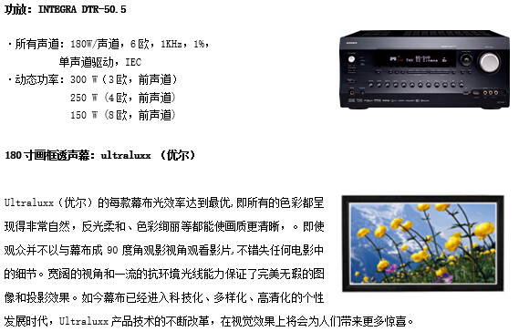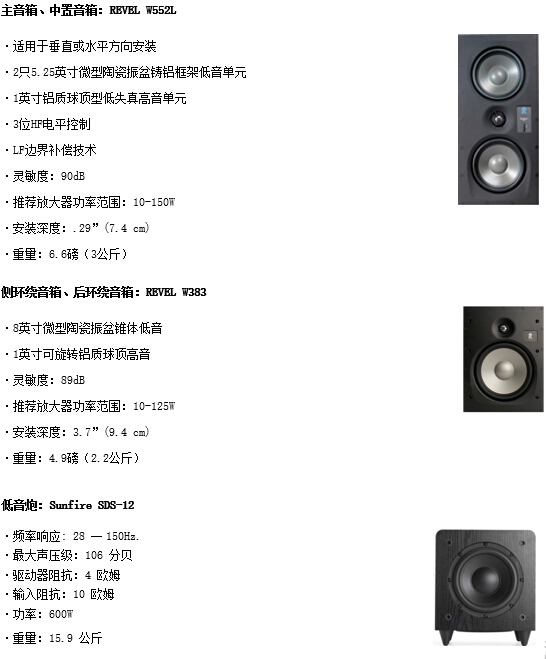 考虑到将视听室空间的最大化利用,同时达到最佳的视听效果,将采用7.2声道影院音箱。投影幕布方面,综合考虑前墙宽度,观影距离,房间高度,以及观影效果,建议幕布德国优尔180寸画框透声幕。以下是我们为本案推荐选择的主设备。