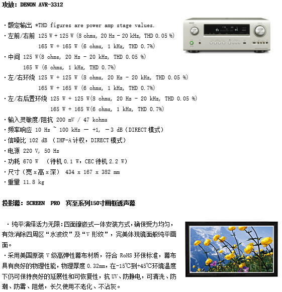 考虑到将视听室空间的最大化利用,同时达到最佳的视听效果,我们将采用7.2声道影院音箱。投影幕布方面,综合考虑前墙宽度,观影距离,房间高度,以及观影效果,建议幕布采用美国锐普宾至系列150寸画框透声幕。以下是我们为本案推荐选择的主设备。